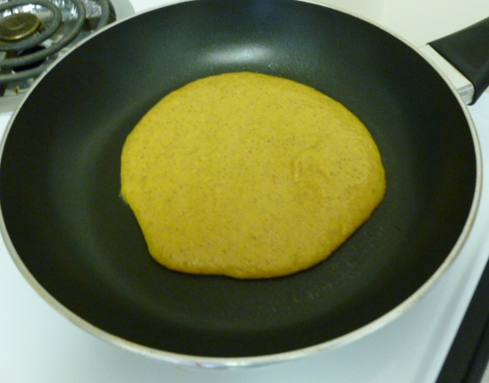 - Coat a saucepan with non-stick spray and set over MEDIUM heat. Pour 1/2 of the mixture into the warm pan and spread till it is a circle about 7 - 8 inches in diameter.